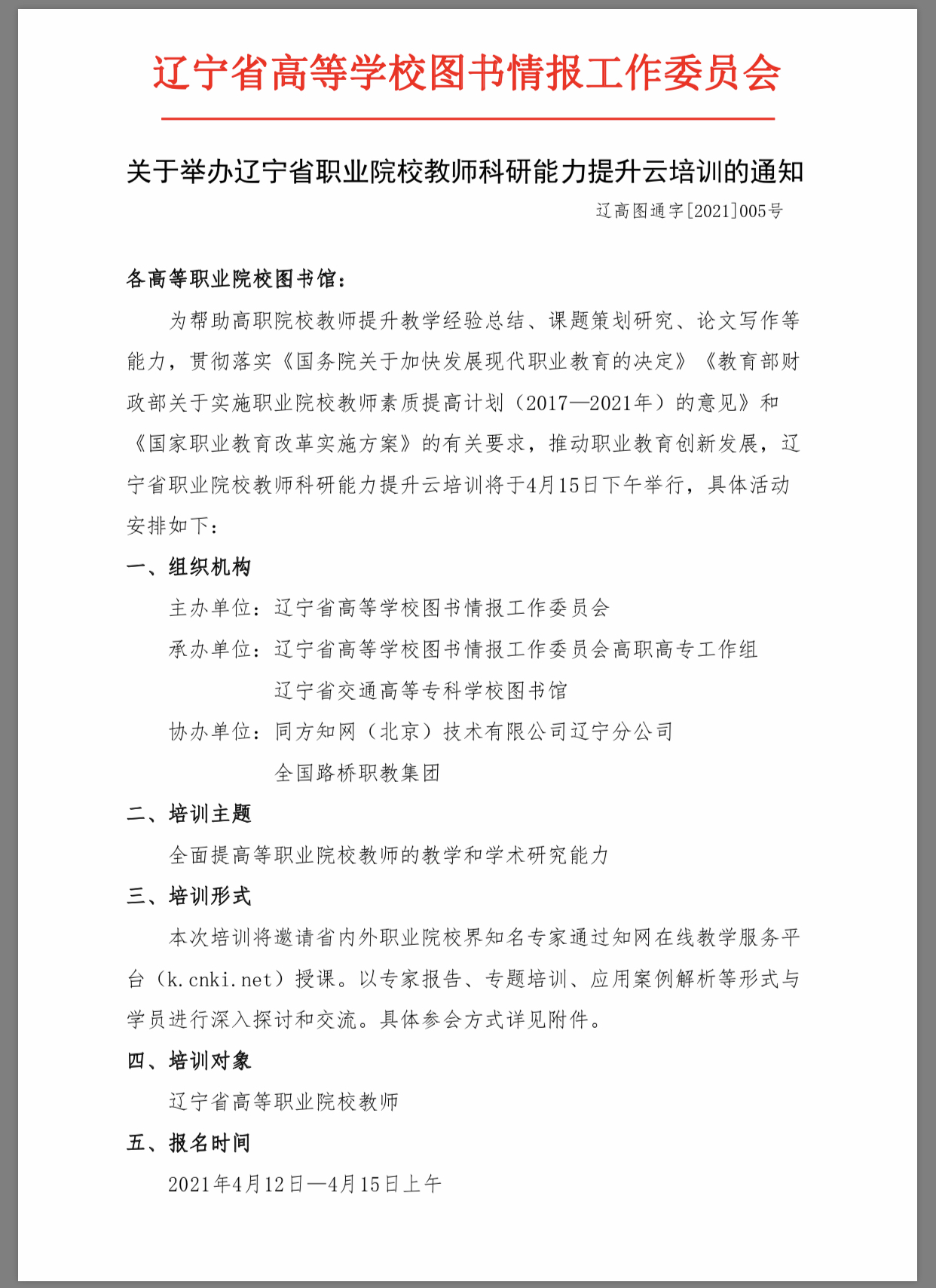 为帮助高职院校教师提升教学经验总结、课题策划研究、论文写作等能力,贯彻落实《国务院关于加快发展现代职业教育的决定》《教育部财政部关于实施职业院校教师素质提高计划(2017—2021年)的意见》和《国家职业教育改革实施方案》的有关要求,推动职业教育创新发展,辽宁省高等学校图书情报工作委员会举办辽宁省职业院校教师科研能力提升云培训,具体活动安排如下: